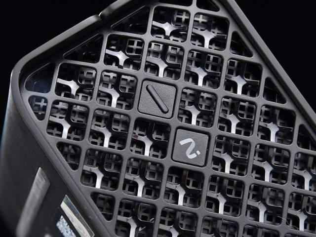 前面板靠上方正中位置有两个实体菱形面板,靠上方的是电源键,下方则是产品logo。