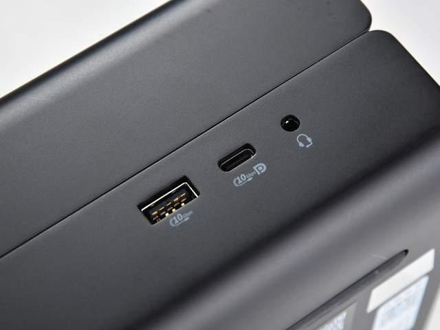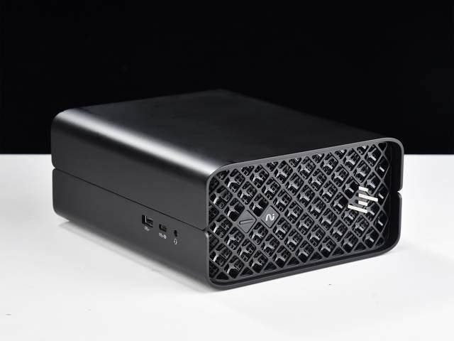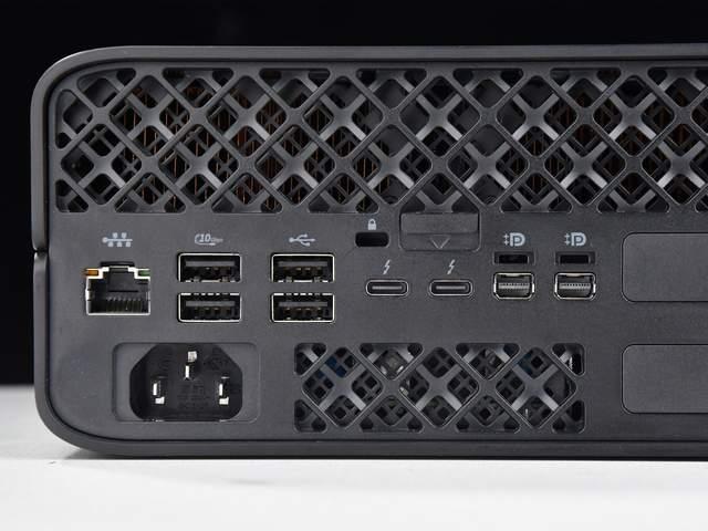 对于迷你主机来说,优异的扩展性必不可少,惠普z2 mini g1a也不例外。这款机器在机身左侧设计有1个10gbps传输速度的usb type-a可充电接口,在其右侧配有1个10gbps传输速度的usb type-c接口,并且支持usb对外供电和dp 2.1视频传输,再靠右侧是1个3.5mm耳麦插孔。