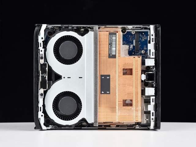 打开侧盖之后可以看到机器内部的情况,主板区域被大面积的铜制散热鳍片以及2个风扇所覆盖。另外可以看到这款机器的风扇与散热鳍片之间衔接紧密,保证了出色的功耗释放和散热效率。