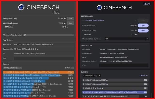 其实此前我们测试过锐龙ai ma×+ 395处理器的性能,而锐龙ai ma×+ pro 395与前者规格相同,只是增加了amd pro企业级安全管理技术,所以就看机器模具的散热设计是否能进一步帮助性能得到释放。首先从cinebench r23和2024测试来看,惠普z2 mini g1a确实做到了:在r23测试标准下,单核得分1938,多核得分37708;2024标准下单核得分110,多核得分1881。多核性能都比此前我们测试的成绩要高出不少。