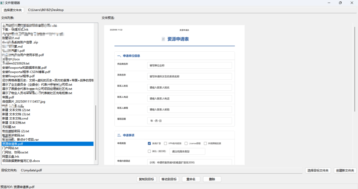 3.底部操作区域: 包括用于选择目标目录的控件,以及执行复制、移动、重命名和删除等操作的按钮。