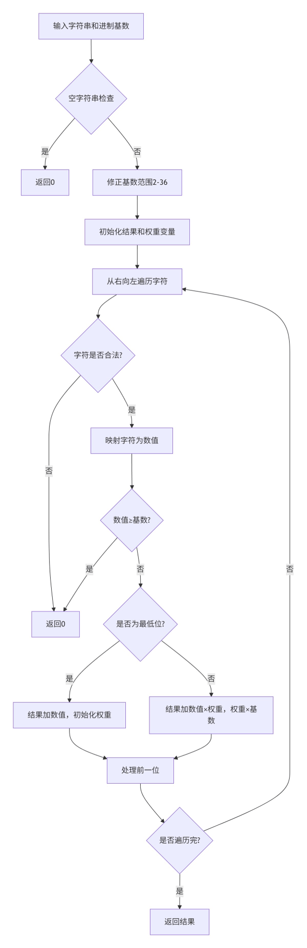 - 参数验证:检查输入字符串是否为空,修正进制基数到有效范围(2-36)