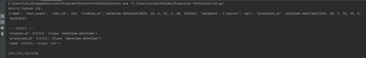 print(f"'processed_at' 的类型是: {type(data_with_datetime['metadata']['processed_at'])}")