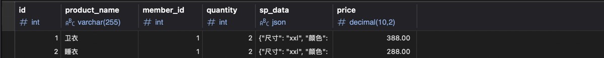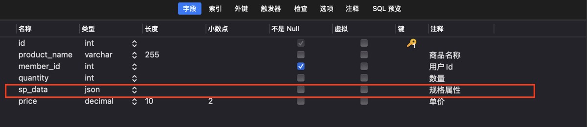 此处如果使用string类型存入数据库,每次获取数据以及保存数据都需要手动进行json格式和string类型的转换,为了避免这个情况,可以直接在数据库中设置该字段spdata为json类型,并且在项目中使用json处理器进行自动转换。