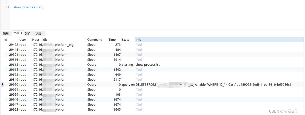 1:字段“db”代表数据库名,字段“info”代表正在执行的sql,字段“command”代表当前的状态