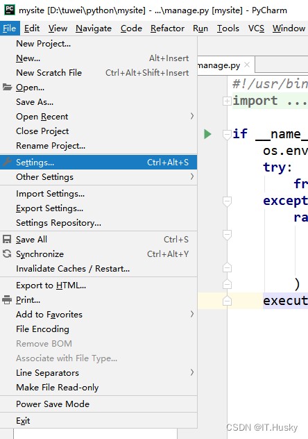 在pycharm创建一个项目,并且进入到项目中,点击左上角文件【file】,选择设置【settings】