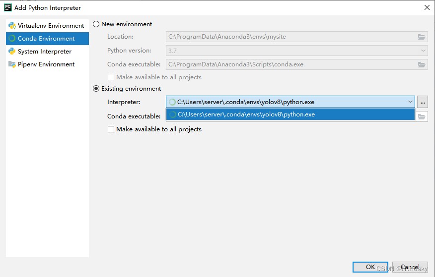 进入conda环境【conda environment】,选择现有环境【existing environment】中的指定解释器【interpreter】,最后选择确定【ok】即可完成