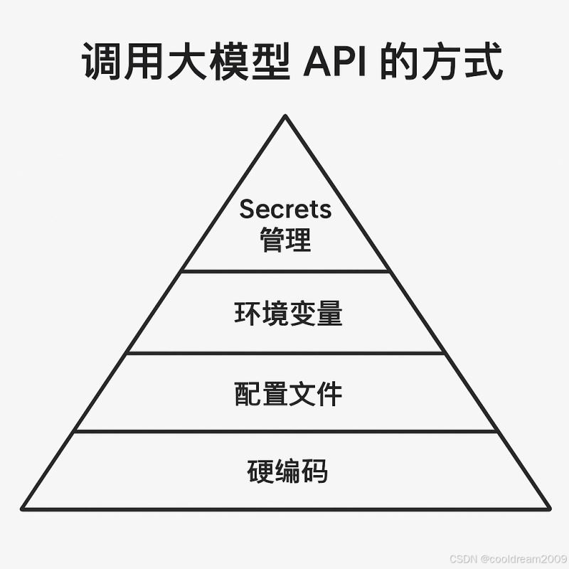 不同的配置方式适用于不同的开发阶段和部署场景,从本地调试到企业级生产环境都有相应的最佳实践。本文将系统介绍调用大模型 api 的多种方式,包括硬编码、配置文件、环境变量、命令行参数、secrets 管理服务等,并对比它们的优缺点与适用场景。