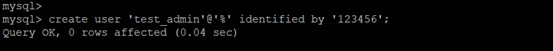 create user ‘test_admin'@‘%' identified by ‘123456';