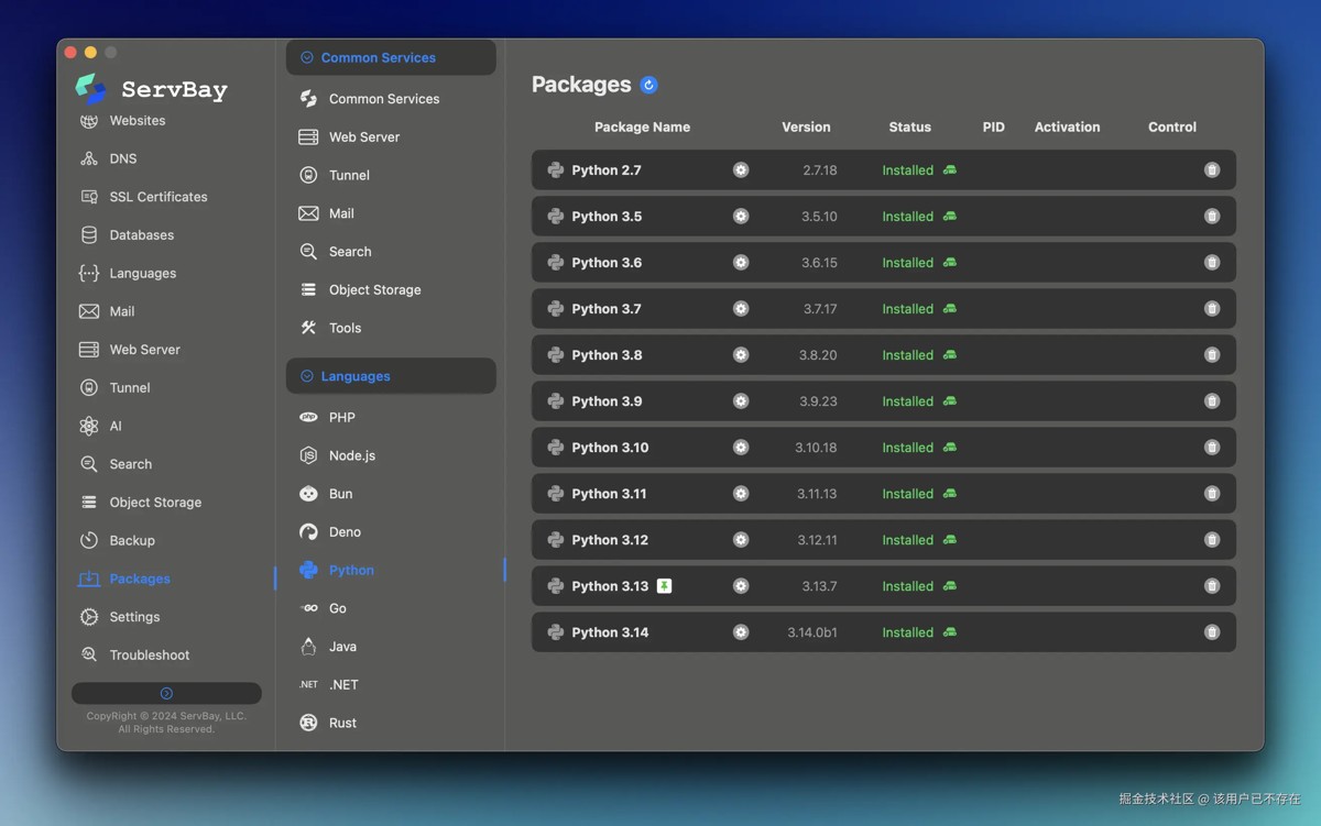 以前要部署python环境,版本切来切去特别麻烦,尤其是有时候要维护一个python 2的老项目,同时又要写python 3的新功能。servbay能一键部署好python环境,而且可以自由切换不同的python版本,甚至让多个版本同时运行。不管是python 2.x的老古董还是最新的python 3.x,它都能轻松搞定。