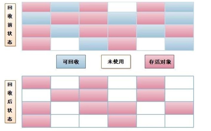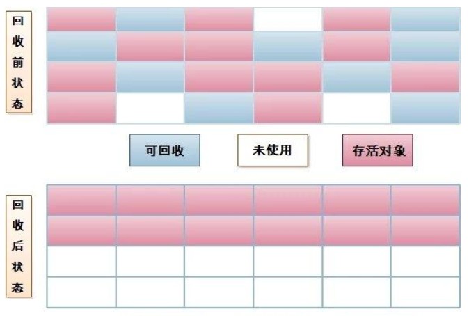 - 流程:将存活对象复制到另一块内存区域 → 清空原区域。