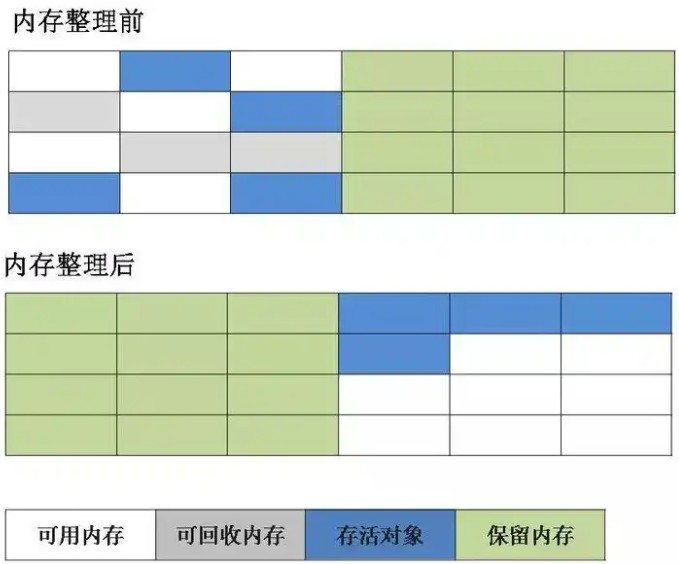 - 流程:标记存活对象 → 移动对象到内存一端 → 清理边界外内存。