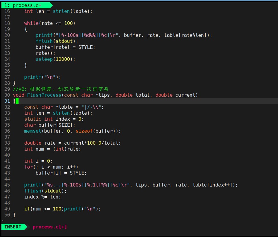 printf("[%-100s][%d%%][%c]\r", buffer, rate, lable[rate%len]);