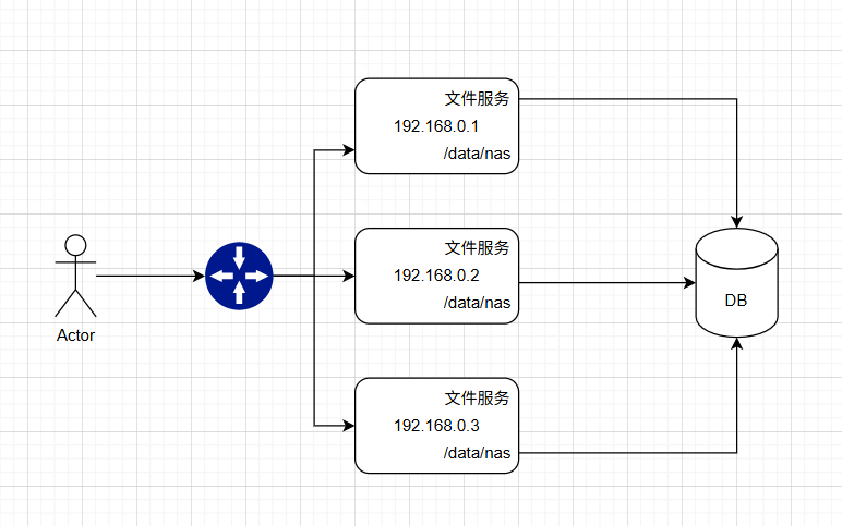 如上图,如果文件服务部署在不同服务器,写入各自的/data/nas目录(目录没有进行共享)下面,并把相关记录记录到数据库,那么就存在一个问题,调用192.168.0.1的文件服务存的文件,只能通过192.168.0.1的文件服务来读取,使用另外两台服务器的文件服务无法读取到,因为它们当前磁盘中文件不存在。