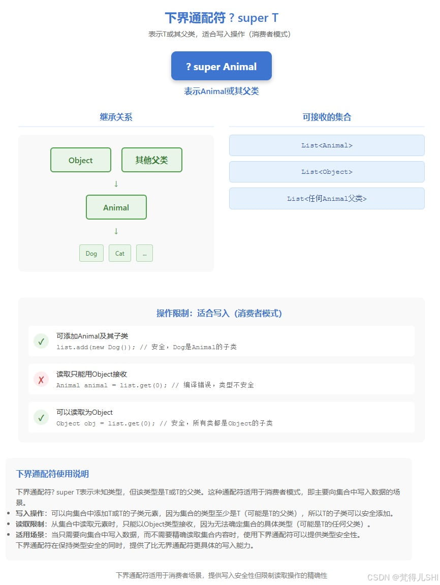 | 下界通配符 | ? super t | t 或 t 的父类 | 写入元素(消费者) | 可添加 t 及其子类,读取用 object |