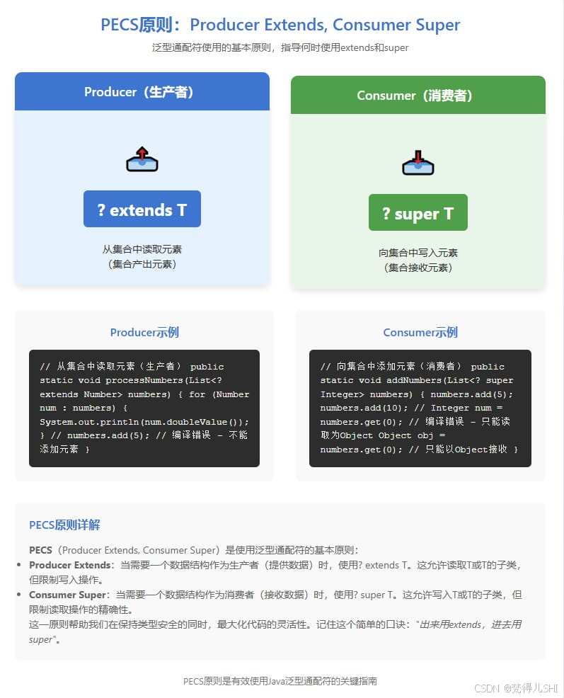 记住 pecs 原则:“producer extends, consumer super”,遇到泛型集合操作时,先判断是 “读” 还是 “写”,再选择对应的通配符。