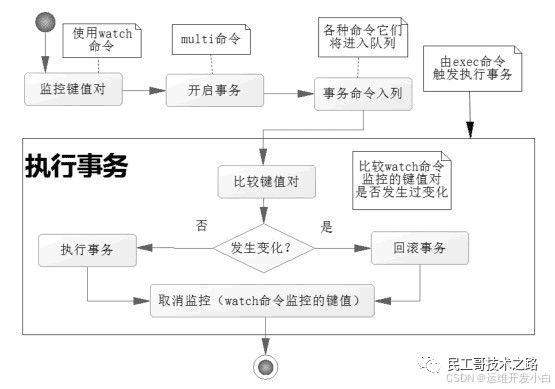 redis使用watch命令来决定事务是继续执行还是回滚,那就需要在multi之前使用watch来监控某些键值对,然后使用multi命令来开启事务,执行对数据结构操作的各种命令,此时这些命令入队列。