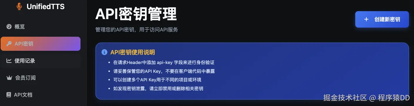 - 从左侧菜单进入“api密钥”页面,创建 api key;