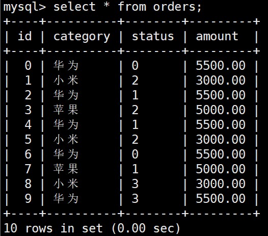 mysql> insert into orders values (0, '华为', '0', 5500.00); mysql> insert into orders values (1, '小米', '2', 3000.00); mysql> insert into orders values (2, '华为', '1', 5500.00); mysql> insert into orders values (3, '苹果', '2', 5000.00); mysql> insert into orders values (4, '华为', '1', 5500.00); mysql> insert into orders values (5, '小米', '2', 3000.00); mysql> insert into orders values (6, '华为', '0', 5500.00); mysql> insert into orders values (7, '苹果', '1', 5000.00); mysql> insert into orders values (8, '小米', '3', 3000.00); mysql> insert into orders values (9, '华为', '3', 5500.00);