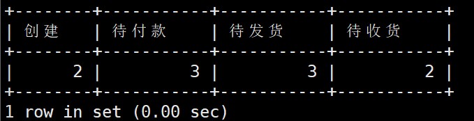 mysql> select -> count(case when status = '0' then 1 else null end ) as 创建, -> count(case when status = '1' then 1 else null end ) as 待付款, -> count(case when status = '2' then 1 else null end ) as 待发货, -> count(case when status = '3' then 1 else null end ) as 待收货 -> from orders;