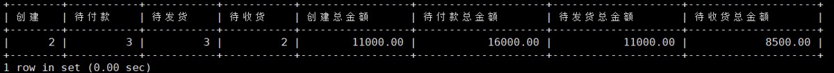 mysql> select -> count(case when status = '0' then 1 else null end ) as 创建, -> count(case when status = '1' then 1 else null end ) as 待付款, -> count(case when status = '2' then 1 else null end ) as 待发货, -> count(case when status = '3' then 1 else null end ) as 待收货, -> sum(case when status = '0' then ifnull(amount,0) else 0 end) as 创建总金额, -> sum(case when status = '1' then ifnull(amount,0) else 0 end) as 待付款总金额, -> sum(case when status = '2' then ifnull(amount,0) else 0 end) as 待发货总金额, -> sum(case when status = '3' then ifnull(amount,0) else 0 end) as 待收货总金额 -> from orders;