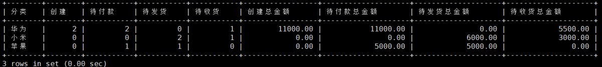 mysql> select category as 分类, -> count(case when status = '0' then 1 else null end ) as 创建, -> count(case when status = '1' then 1 else null end ) as 待付款, -> count(case when status = '2' then 1 else null end ) as 待发货, -> count(case when status = '3' then 1 else null end ) as 待收货, -> sum(case when status = '0' then ifnull(amount,0) else 0 end) as 创建总金额, -> sum(case when status = '1' then ifnull(amount,0) else 0 end) as 待付款总金额, -> sum(case when status = '2' then ifnull(amount,0) else 0 end) as 待发货总金额, -> sum(case when status = '3' then ifnull(amount,0) else 0 end) as 待收货总金额 -> from orders group by category;