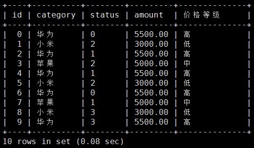 mysql> select * , -> (case when amount<= 3000 then '低' -> when amount<= 5000 then '中' -> when amount<= 10000 then '高' -> else '未知区间' end) as 价格等级 -> from orders;