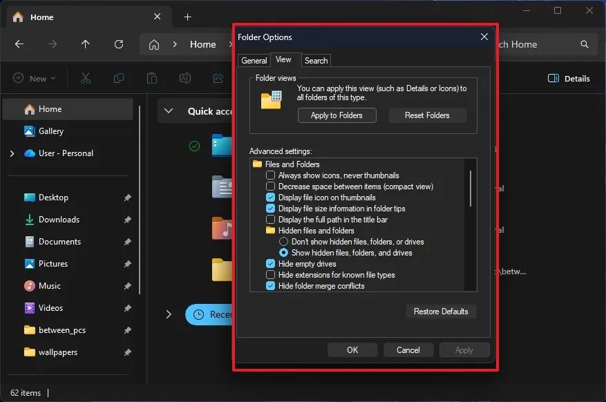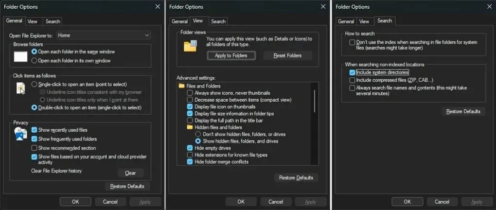 本次更新最受关注的改进,是微软进一步扩大文件资源管理器(file explorer)的深色模式覆盖范围。“文件夹选项”对话框及其所有子标签页此前在深色模式下仍显示为白色,破坏了视觉统一性。