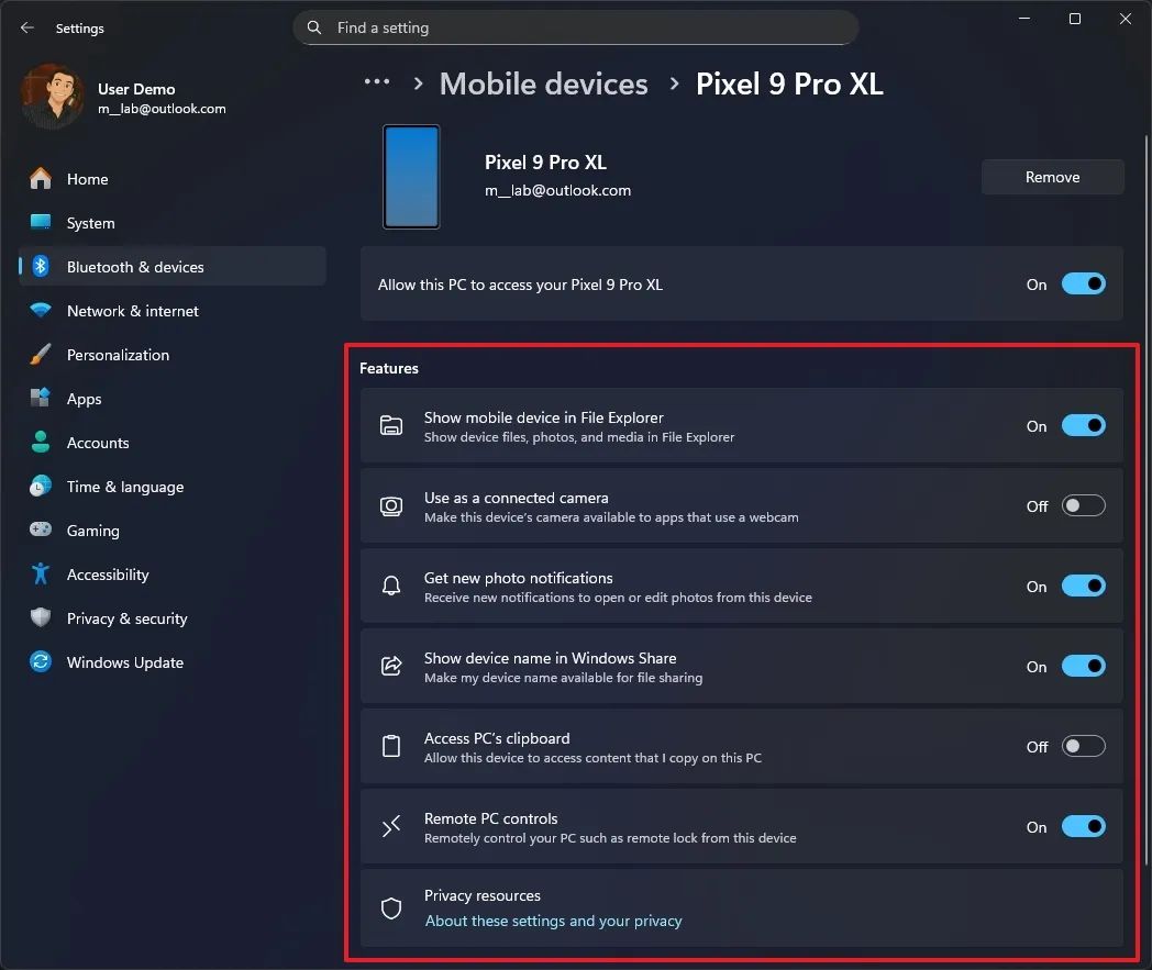 以往连接和管理手机需要跳转到一个独立的页面,而现在所有相关选项都被整合进了“设置 > 蓝牙和设备 > 移动设备”页面内,操作路径更短。