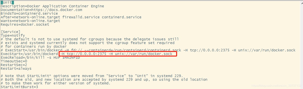 在execstart 后面加上-h tcp://0.0.0.0:2375 -h unix://var/run/docker.sock