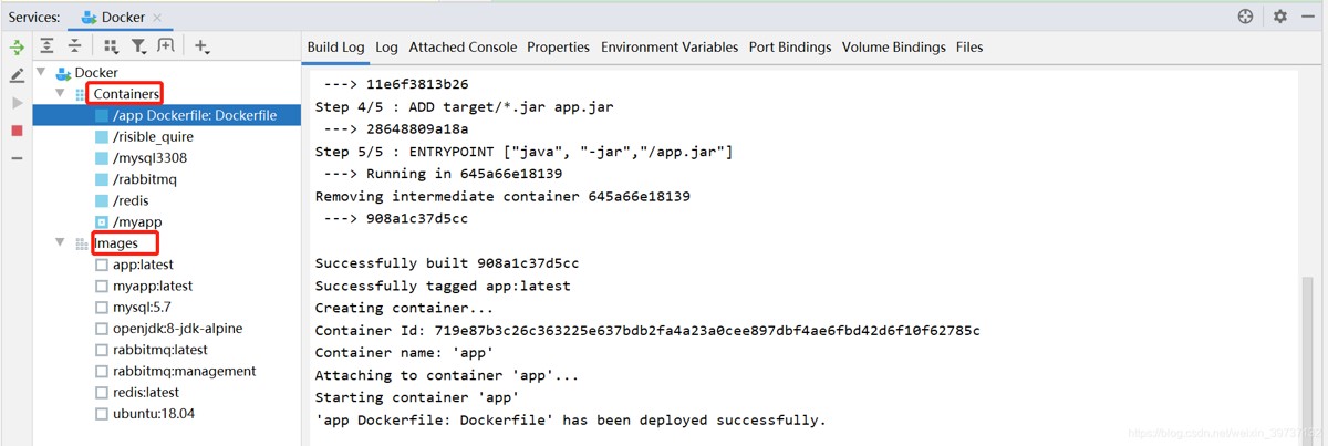 此时idea底部菜单栏窗口可查看到docker所有容器和镜像,并可进行容器和镜像的删除、启动等操作;