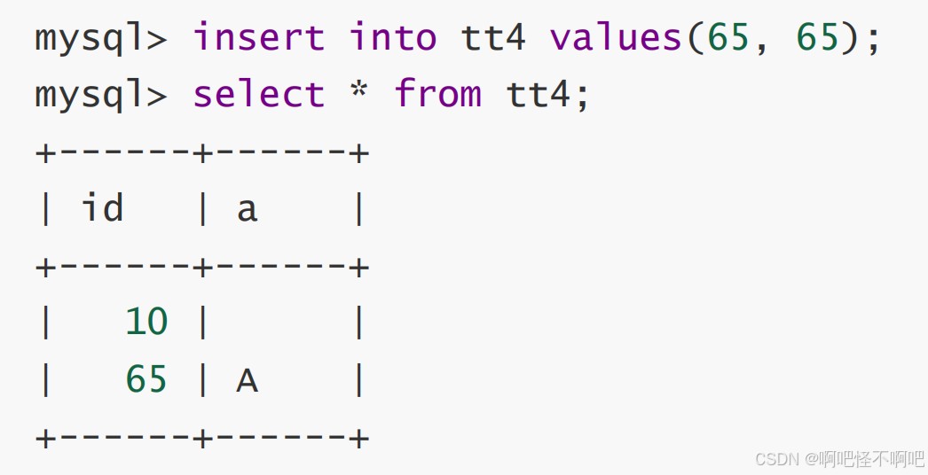 mysql> create table tt4 ( id int, a bit(8)); query ok, 0 rows affected (0.01 sec)