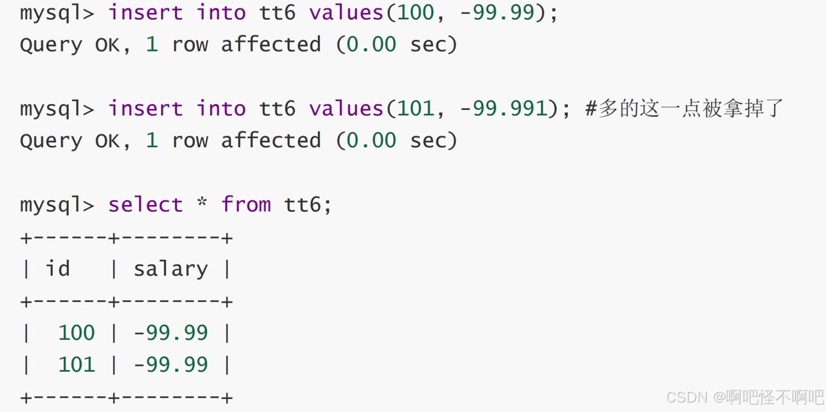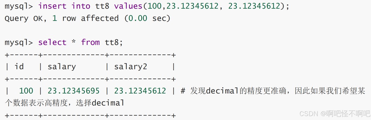 mysql> create table tt8 ( id int, salary float(10,8), salary2 decimal(10,8));