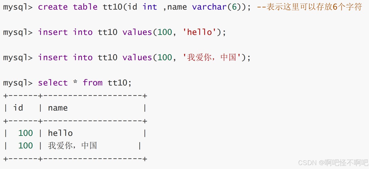 - 如果数据长度有变化,就使用变长(varchar), 比如:名字,地址,但是你要保证最长的能存的进去。