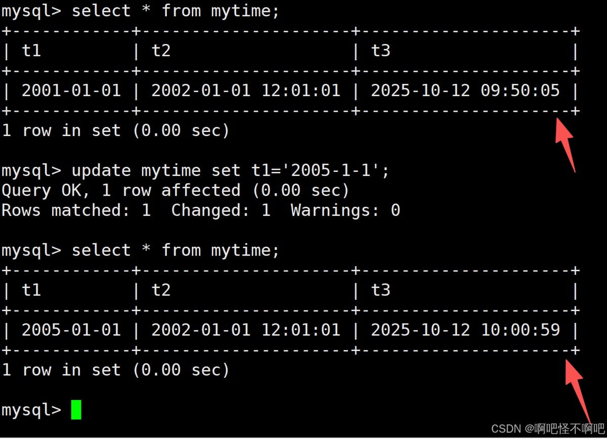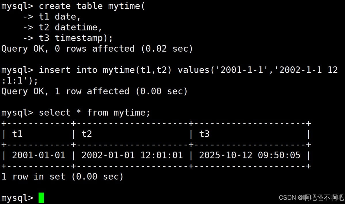 我们来看下面这张图片,其中date类型的t1就是显示年月日,datetime类型的t2就是显示年月日加上时分秒,而timestam类型的t3不用我们自己设置,它会自动给自己加上执行这条指令时的时间。