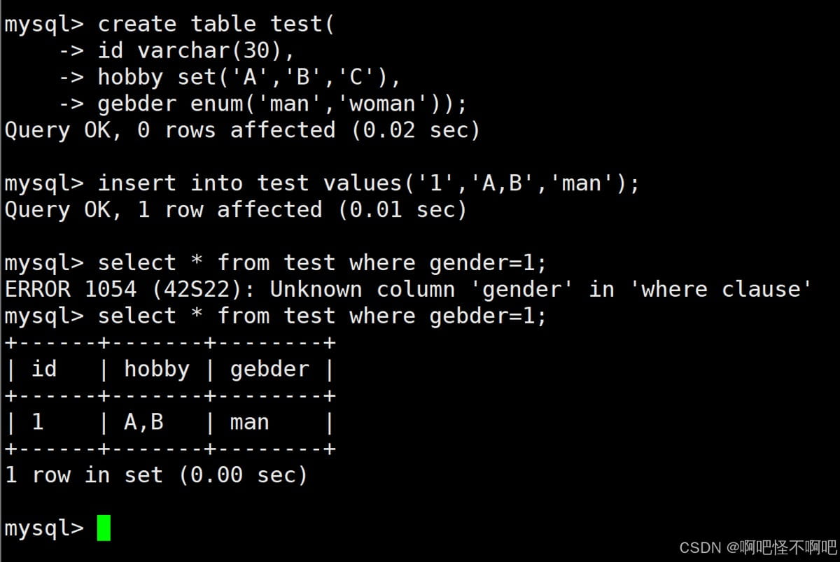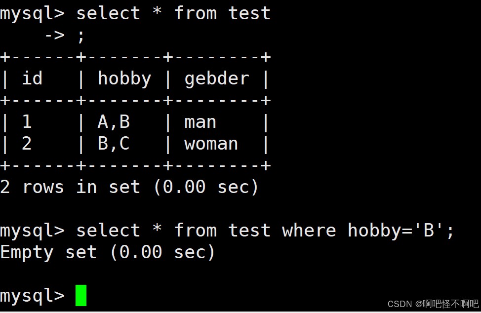 我们看下面这张图片,其中set类型的hobby我们插入了两个值,而enum我们只可以插入一个。