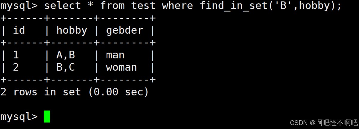如果我们要查找出所有含有b的,那么我们应该用用find_ in_ set函数。