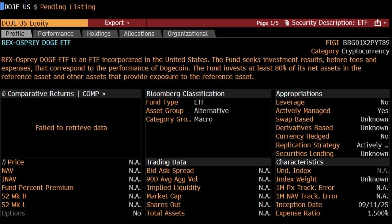 狗狗币9 月份涨势中最大的催化剂是rex-osprey 狗狗币etf(股票代号:doje)的首次亮相,这是美国首支为doge 提供合规曝险的基金。该狗狗币etf计划于2025 年9 月18 日发行,允许投资者透过传统证券帐户追踪doge 的价格走势,而无需直接持有该币。这使得doge 可被退休基金和主流投资组合所配置,这曾是比特币etf和以太坊etf产品的专利。