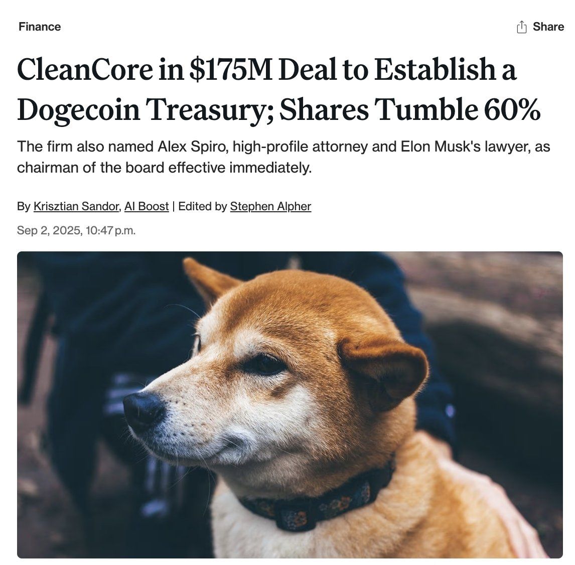 cleancore solution (nyse: zone) 创建狗狗币财库| 资料来源:coindesk