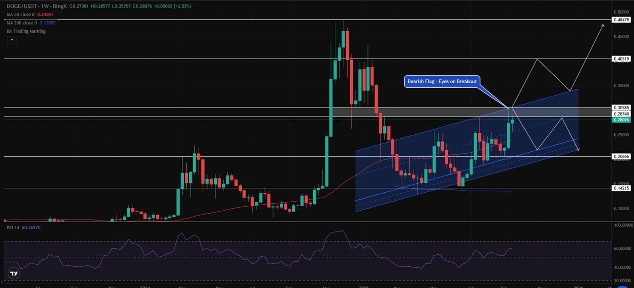 周线图:doge 正在测试旗形阻力位,上涨目标为0.405–0.484 美元