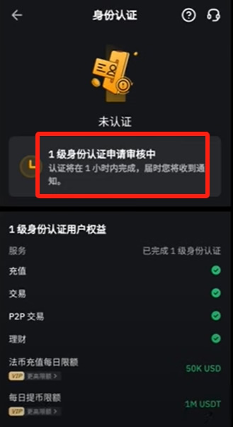 我们来看一下一级身份认证用户的权益。法币充值限额每日是50k美金。这些我们作为散户都已经足够用了。我们点击【立即认证】