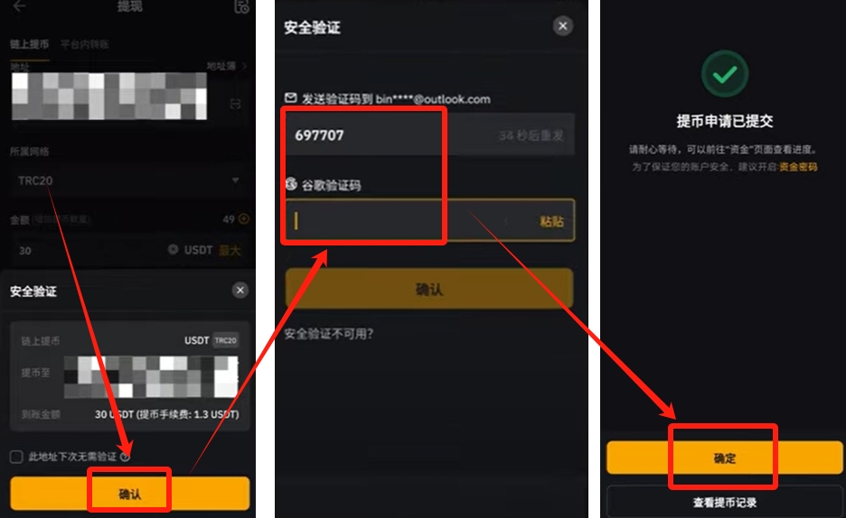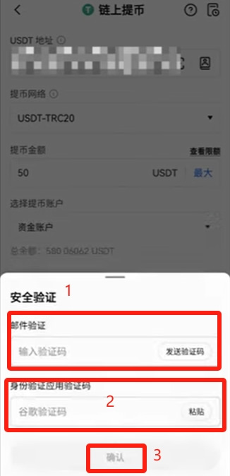 点击【确认】。再获取一下邮箱验证码和谷歌验证码。这时候我们的提币申请就已经提交了。过一会我们去欧易里面查看一下,就可以看到我们的usdt已经回去了。点击【确定】。