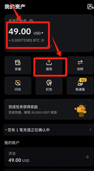 现在可以看到我的usdt已经充值成功了,现在我的bybit里面就有这么多的usdt了。接下来我们再来演示一下,怎么把bybit里面的usdt再提到okx,我们还是在资产的页面,点击【提现】。