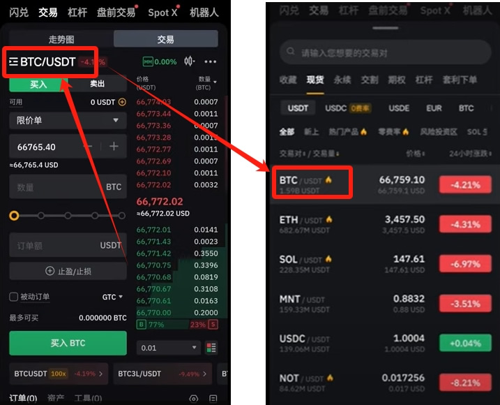 可以选择一下我们想要交易的币种。比如说我想在想购买比特币,那我就可以选择“btc/usdt”这个交易对。