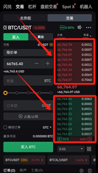 然后在买入的页面,可以看到右边这里的盘口。红色的是卖单,绿色的是买单。这个单子是源源不断的,价格也是一直在变动的。