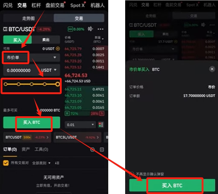 这个时候就需要我们选择你是想使用限价单还是市价单。限价单就是需要我们自己设定一个理想的买入价格,比如说现在的市价是66786,我希望等这个价格跌到66780的时候再买入,我就把这个价格输入进来。再输入购买的数量,再去下单。但是下单之后是需要我们等的。等市价达到了我们设定好的理想价格之后,这个单子才会成交。也就是说我们需要等别人来和我们成交的。如果没有人想要和我们成交,我们就只能一直等。