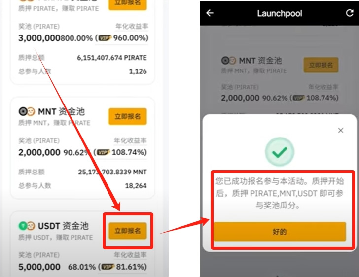 我们可以看到,现在这个正在进行中的项目。这个项目一共有三个资金奖池。我们只需要找到usdt的这个,然后点击“立即报名”。报名成功。