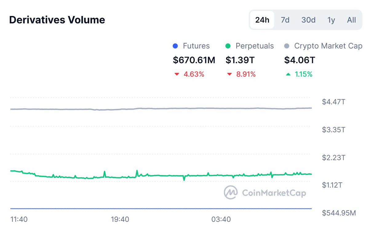 据coinmarketcap数据,过去24小时内,永续合约在加密衍生品交易中占据主导,成交量达到1.39万亿,远超传统期货合约的6.7061亿。