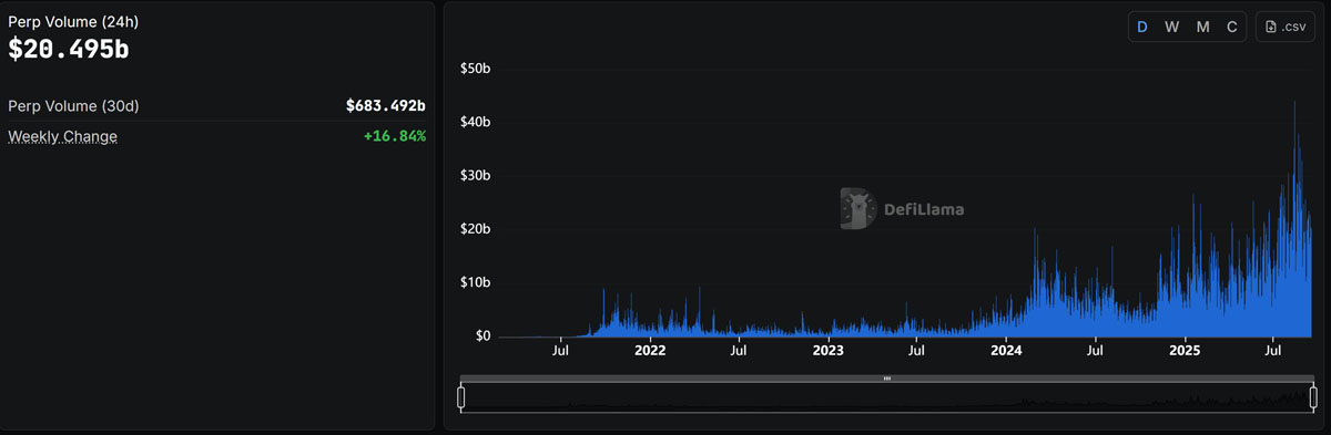 去中心化永续平台共处理了205亿美元的24小时交易量。来源:defillama
