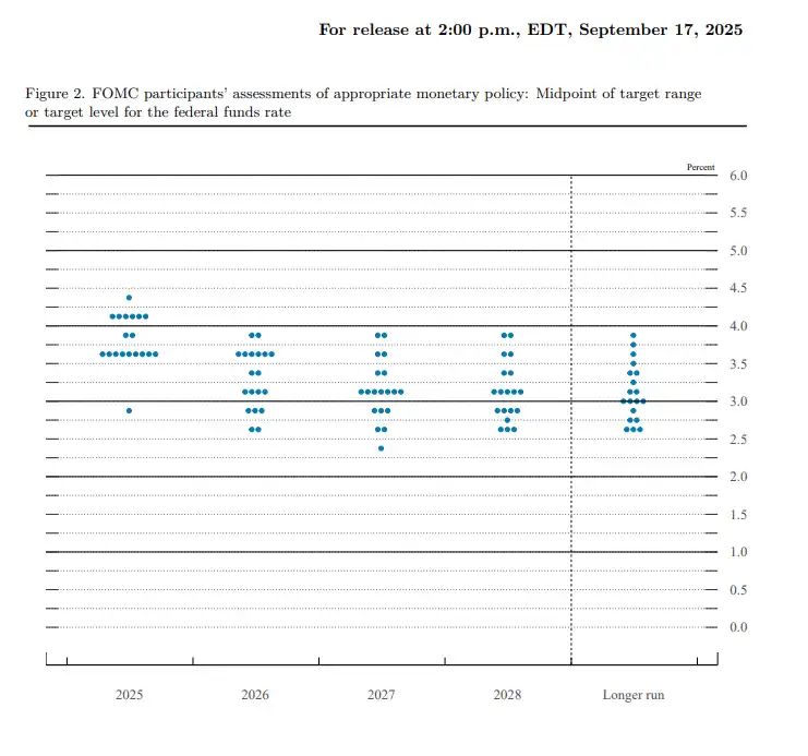 美联储本次 25 个基点的降息,更多是一种「风险管理式降息」,而非开启激进宽松的信号。点阵图显示,2025 年利率预期中值从 3.9% 下调至 3.6%,意味着在已降息一次的基础上,今年还有 50 个基点的空间,大概率会在 10 月和 12 月再各落下一刀。截止目前,10 月美联储再次降息 25 基点的概率为 87.5%。到了 2026 年和 2027 年,预期中值继续下调至 3.4% 与 3.1%,强化了市场对中长期温和宽松的判断。但长期利率锚仍稳在 3.0%,说明美联储心中的「中性利率」并未改变。